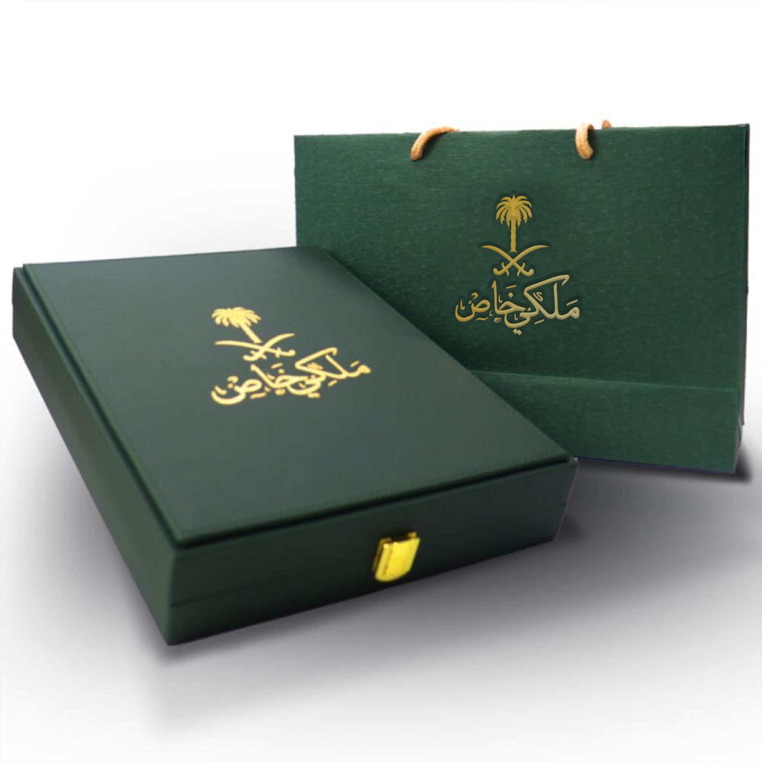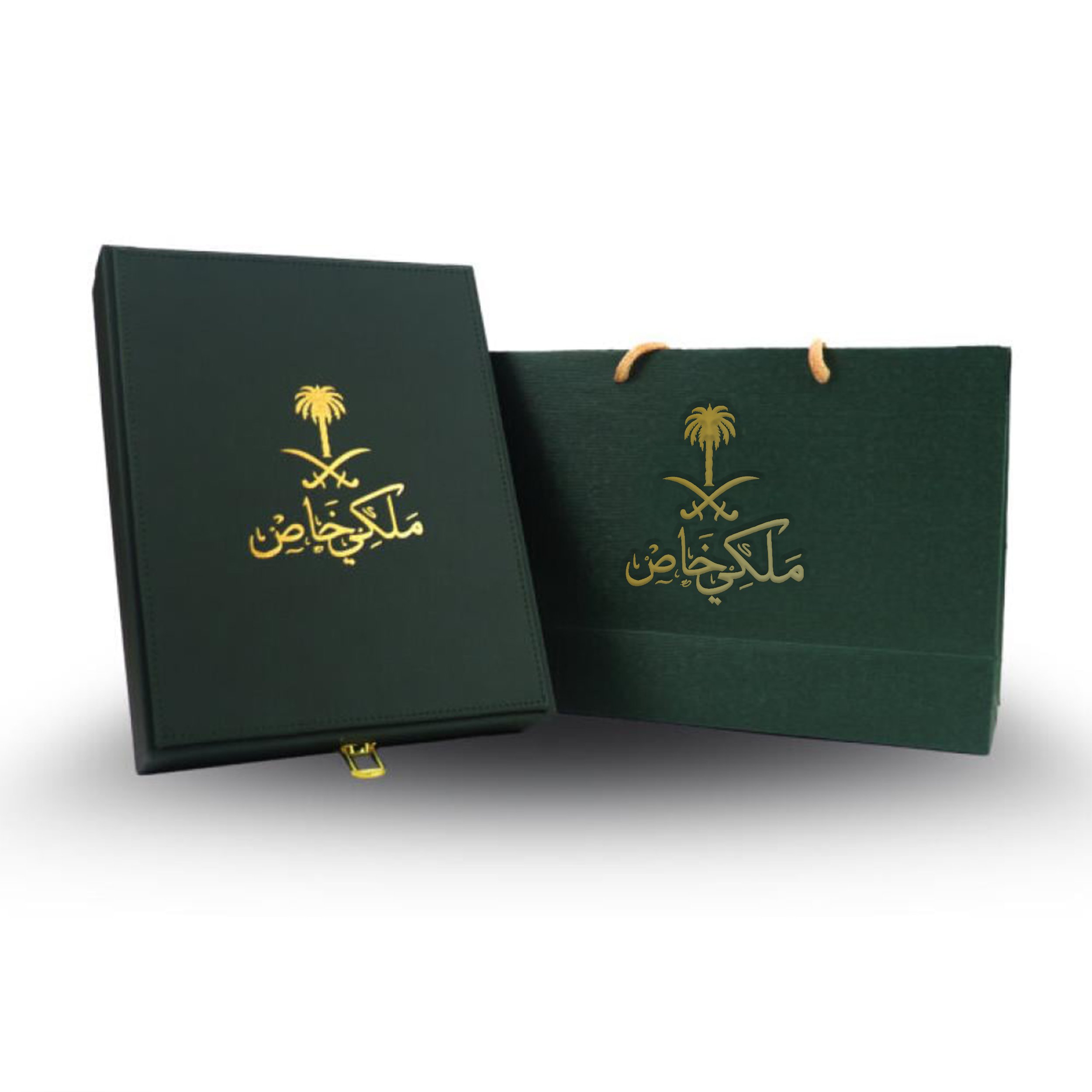 - بوكس جلدي فاخر باللون الأخضر مع شعار ملكي خاص مطبوع بالذهبي.