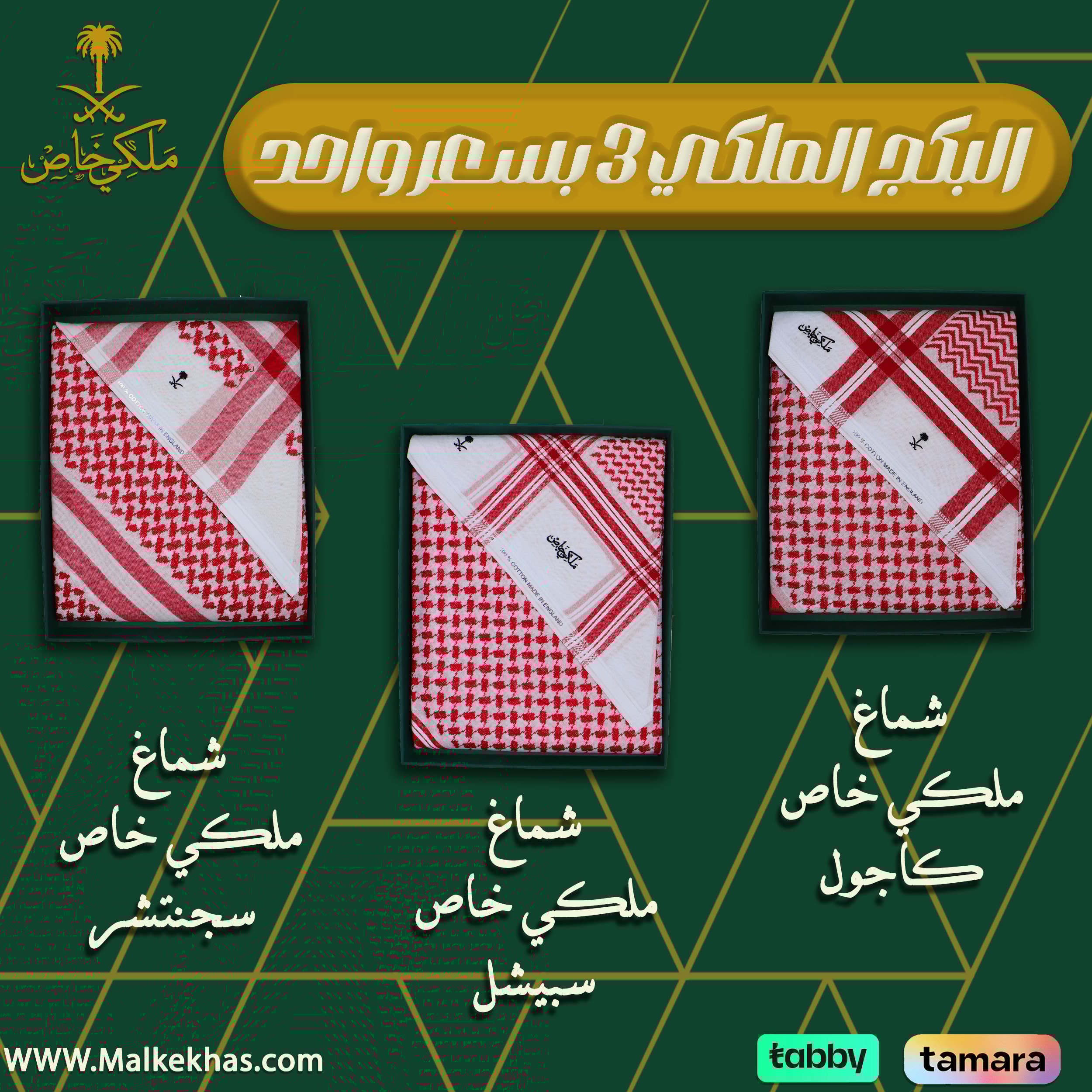 تمتع بإطلالة ملكية تجمع بين الأناقة والتميز مع عرض خاص يضم ثلاثة أشمغة فاخرة من ماركة ملكي خاص: إصدار كاجوال، إصدار سبيشل، وإصدار سجنتشر.